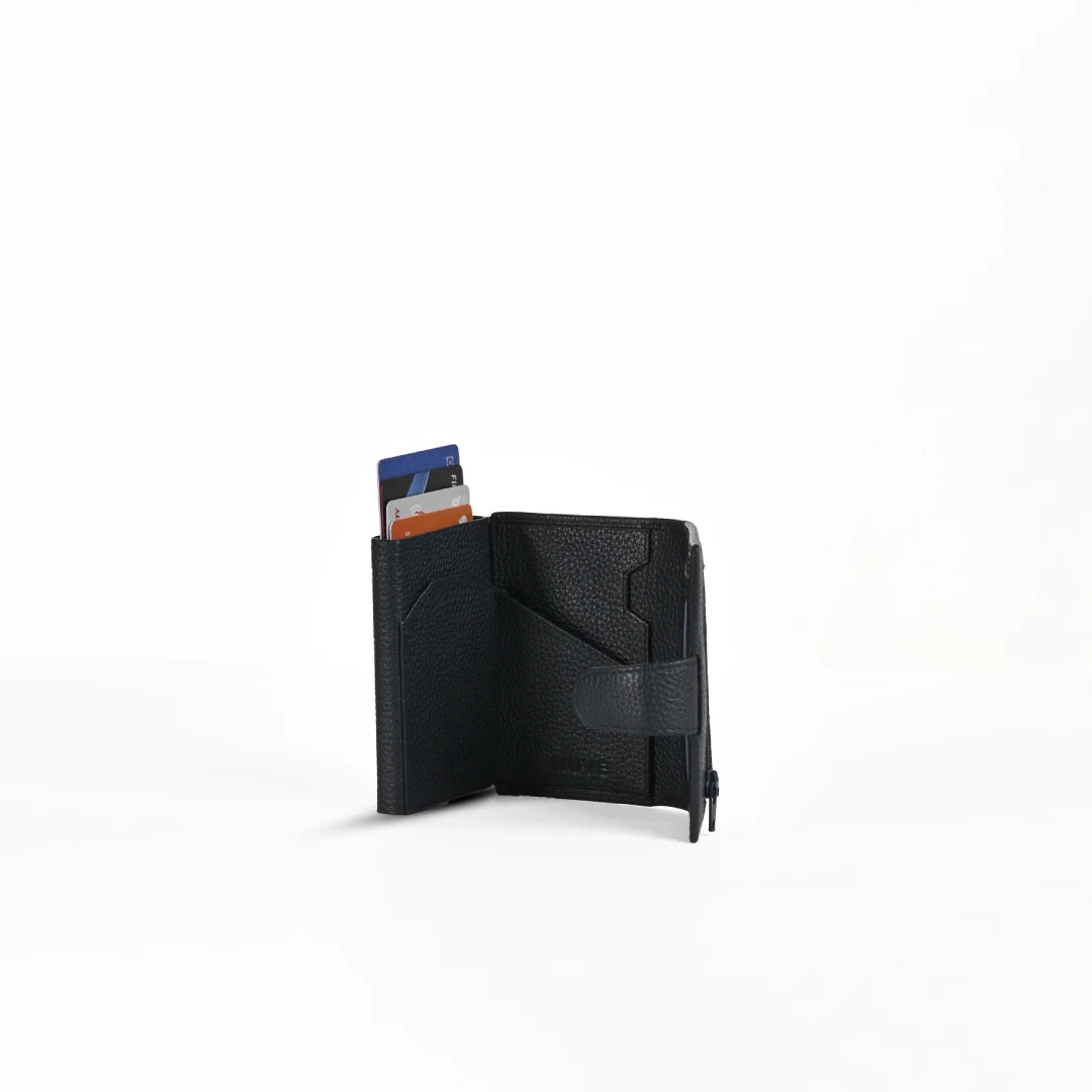 This compact secrid holder is designed with a tri-fold structure that balances minimalism and utility. Crafted from 100% genuine leather, its clean form is secured by a button closure, and it comes in timeless Black and Navy shades. Inside, a single zip pocket offers storage for coins or essentials, while the Automan lining ensures everything stays protected. It's a practical, travel-friendly companion that easily slips into your pocket or bag. A secure and compact holder for cards, cash, or keys — built for convenience without bulk.