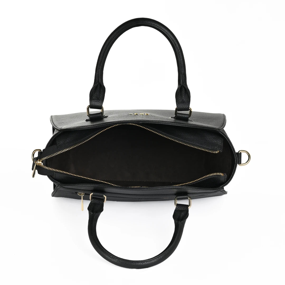 Simple and well-structured, this handbag is designed with everyday functionality in mind. Its silhouette is upright and softly rounded at the top, giving it a balanced, approachable look. The metal zipper runs smoothly across the main compartment, while a mix of zip and open pockets keeps things organized inside. Crafted from 100% genuine leather grain, it comes in classic tones like Black and Stone, and includes both a top handle and a detachable shoulder strap for flexible use. A clean and comfortable choice for those who like a medium-sized handbag with everyday versatility.