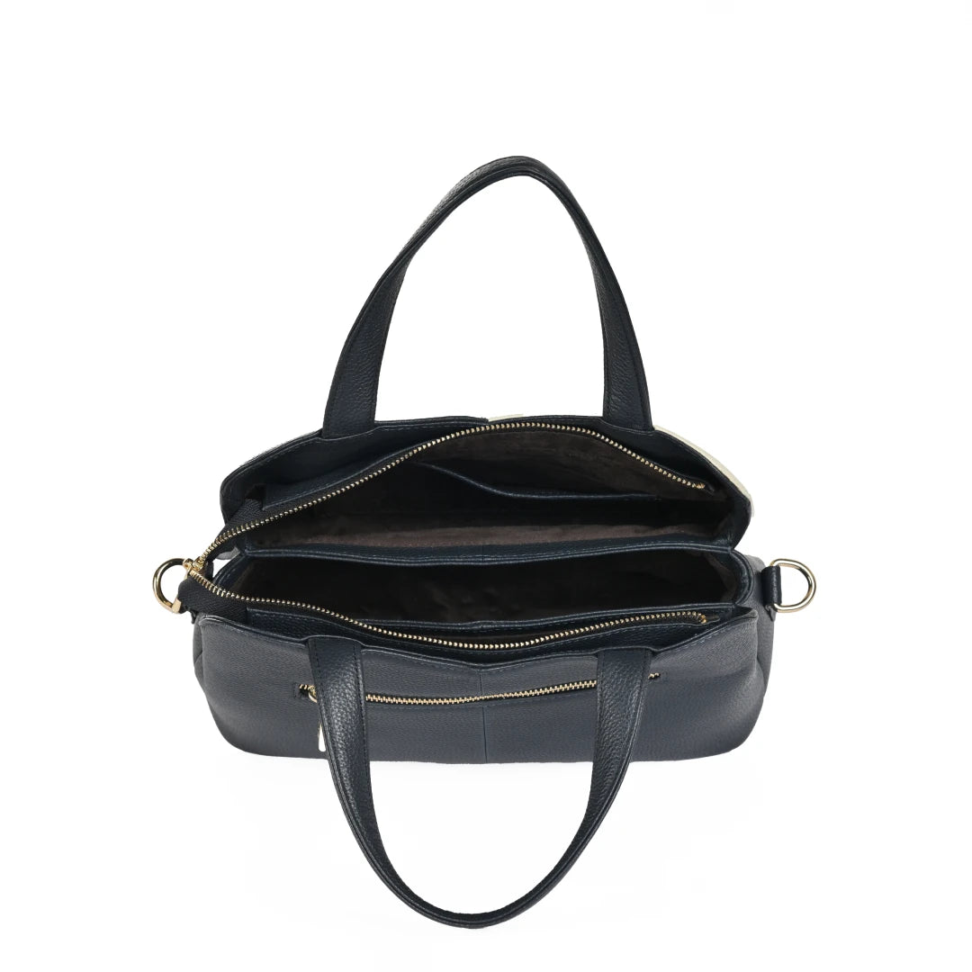 Spacious, structured, and clean-lined — this handbag is designed for those who like to keep things organized without losing visual simplicity. The top handle offers a refined carry option, while the detachable shoulder strap makes it practical for busier days. With six interior pockets and a sturdy metal zip closure, it’s built to hold everything from daily essentials to a small tablet or notebook. Available in Black and a striking bi-colour mix of Navy and Stone, this piece blends classic style with quiet contrast. Ideal for work, short trips, or anywhere you need space, structure, and classy polish.