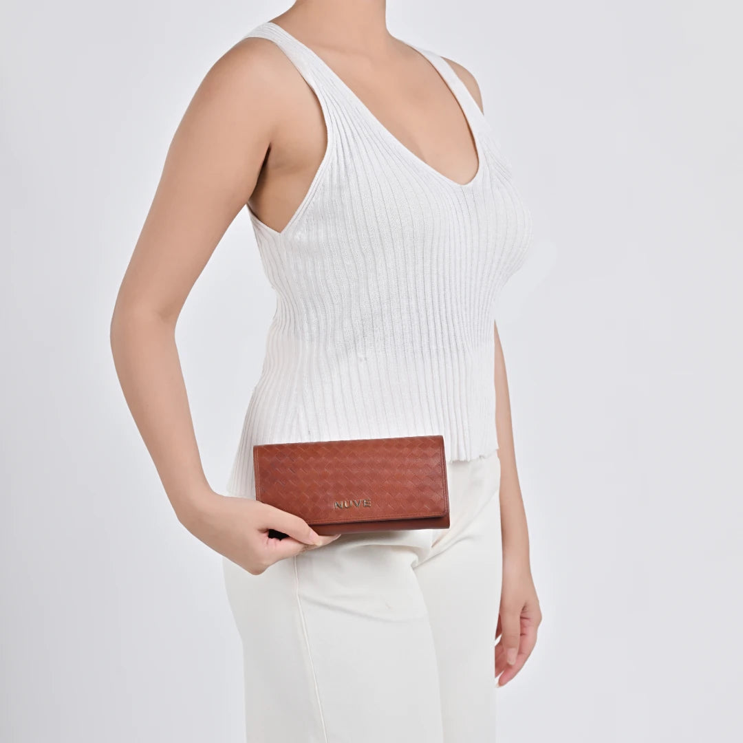Blending a soft exterior with a structured interior, this flap-style purse is crafted from 100% genuine leather grain and designed to slip easily into your handbag or carry solo. The body is finished in muted tones of Tan and Wine, with a secure button closure under the front flap. Inside, a single zip pocket provides space for change or folded notes, while the printed lining adds a refined detail. A compact flap purse for keeping essentials secure while maintaining a clean, elegant look.