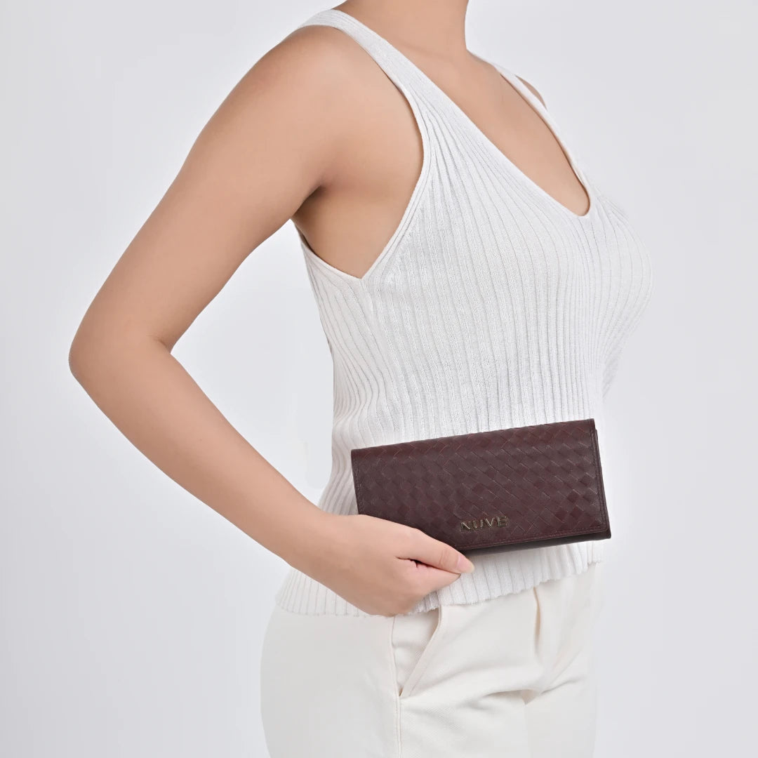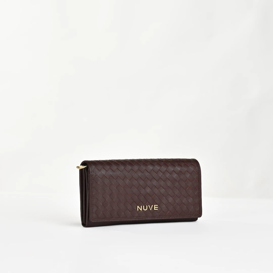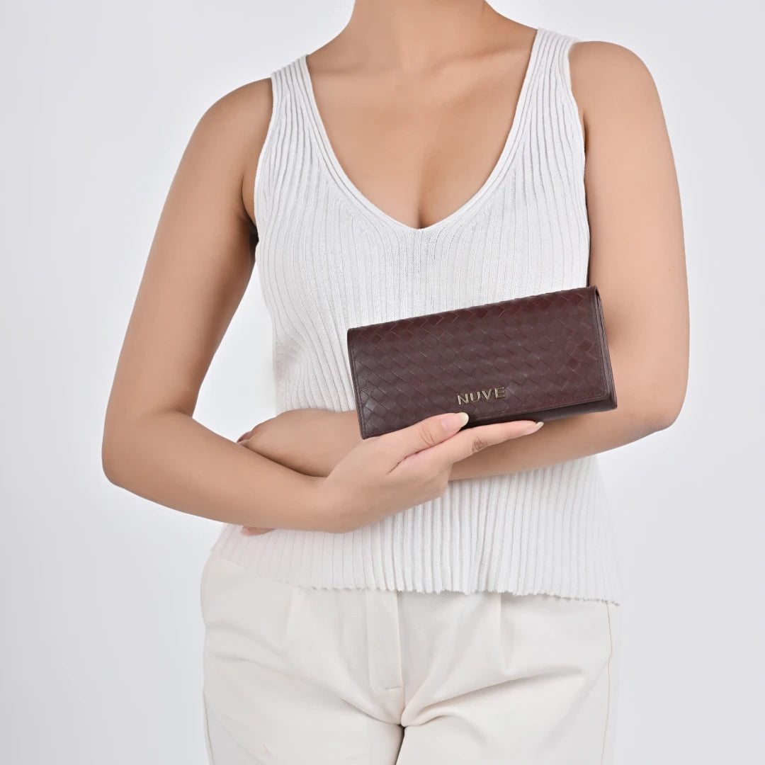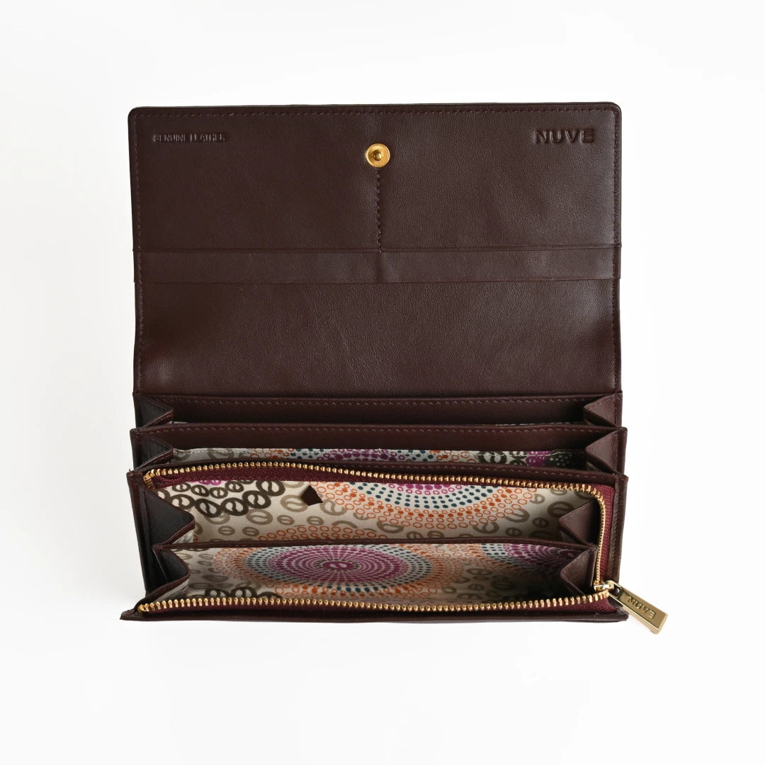 Blending a soft exterior with a structured interior, this flap-style purse is crafted from 100% genuine leather grain and designed to slip easily into your handbag or carry solo. The body is finished in muted tones of Tan and Wine, with a secure button closure under the front flap. Inside, a single zip pocket provides space for change or folded notes, while the printed lining adds a refined detail. A compact flap purse for keeping essentials secure while maintaining a clean, elegant look.