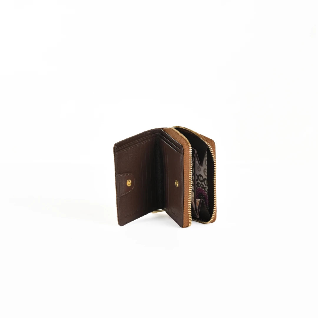Compact and practical, this zip-around purse is shaped for single-handed use and built with textured contrast. Made from 100% genuine leather, it offers a soft-yet-structured silhouette in rich tones of Brown and Navy. A button closure secures the interior while a single zip pocket neatly holds change or small valuables. The printed lining completes the purse with a subtle accent. A small, structured purse for everyday essentials — built to last and made to travel light.