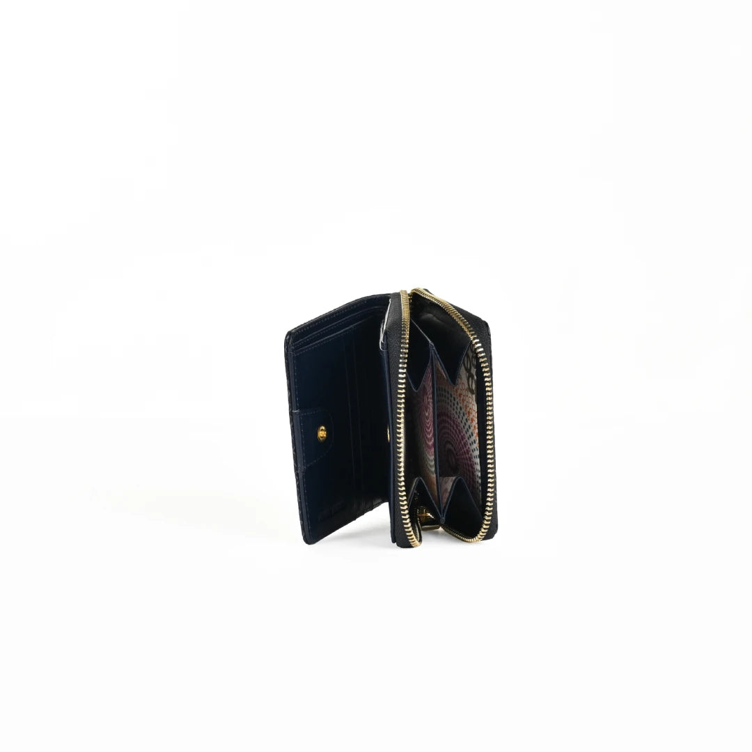 Compact and practical, this zip-around purse is shaped for single-handed use and built with textured contrast. Made from 100% genuine leather, it offers a soft-yet-structured silhouette in rich tones of Brown and Navy. A button closure secures the interior while a single zip pocket neatly holds change or small valuables. The printed lining completes the purse with a subtle accent. A small, structured purse for everyday essentials — built to last and made to travel light.