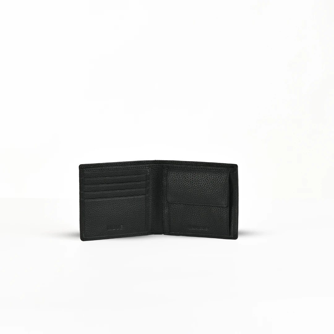 Simple, compact, and built for daily use, this bi-fold wallet reflects subtle sophistication. The outer texture showcases rich grain leather in Black or Navy, with a clean NUVE logo embossed in metallic contrast. Despite its slim profile, the wallet keeps things organized with a buttoned compartment for essentials. Perfect for minimalists who value both function and a refined feel. A classic everyday wallet that fits neatly in your pocket while offering a clean and confident design.