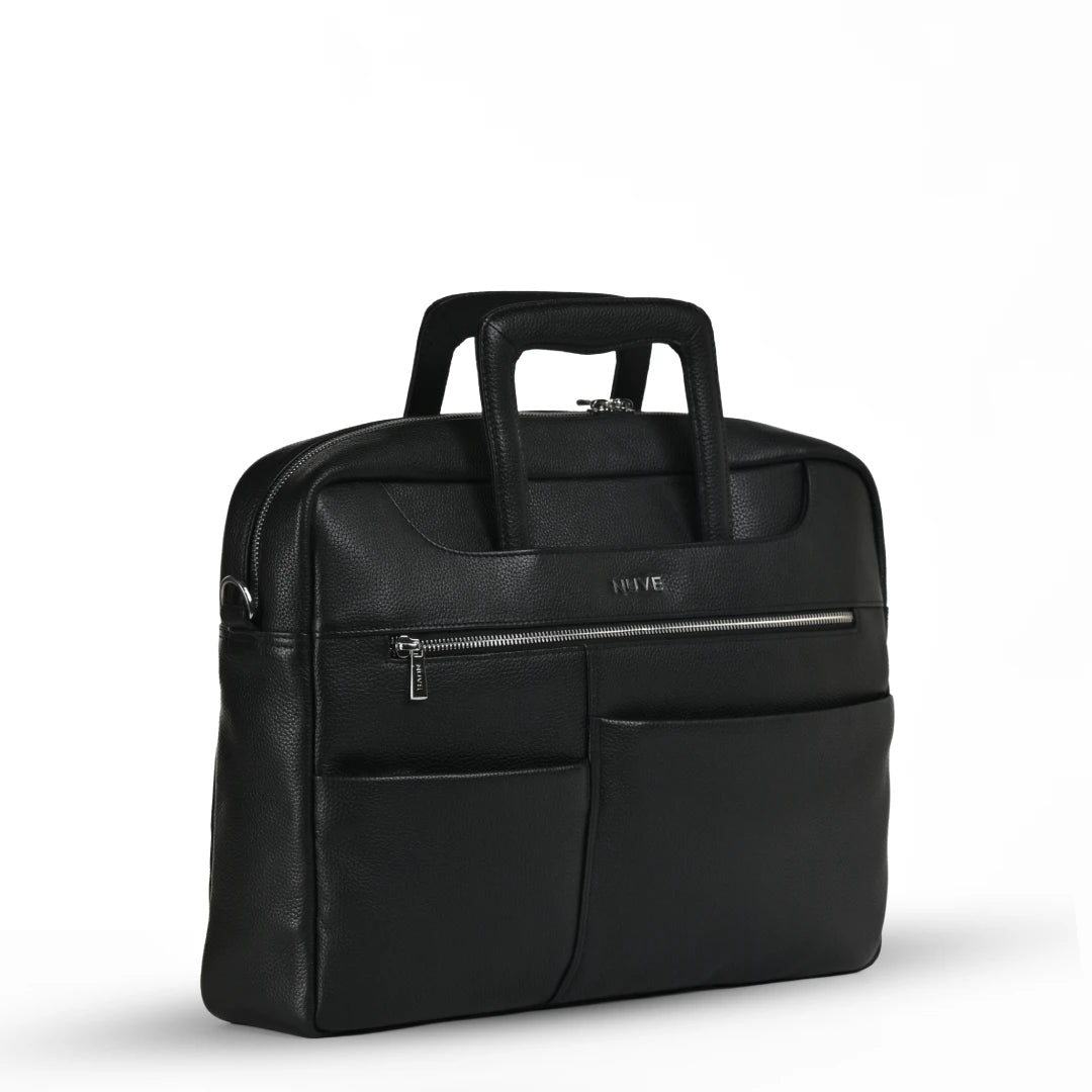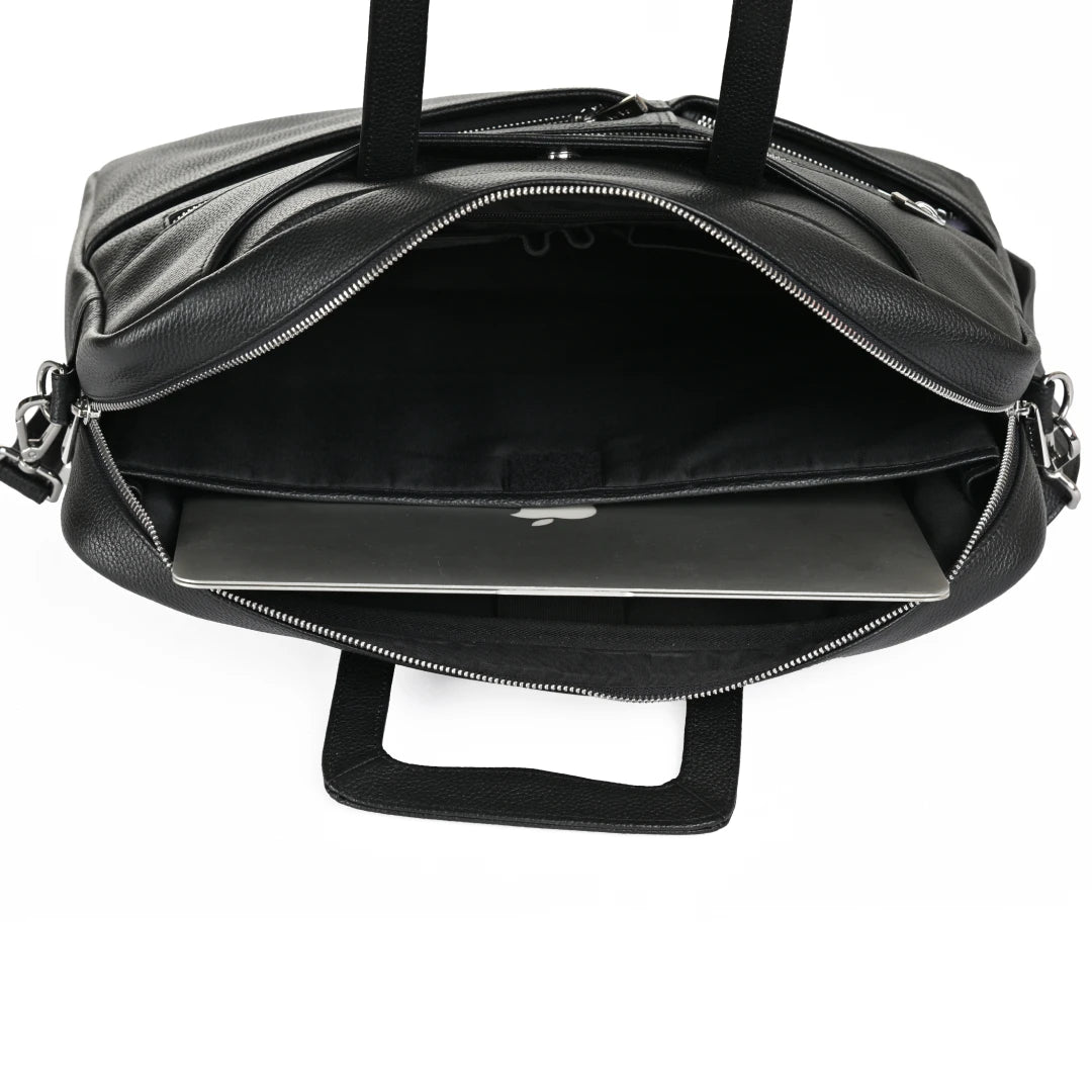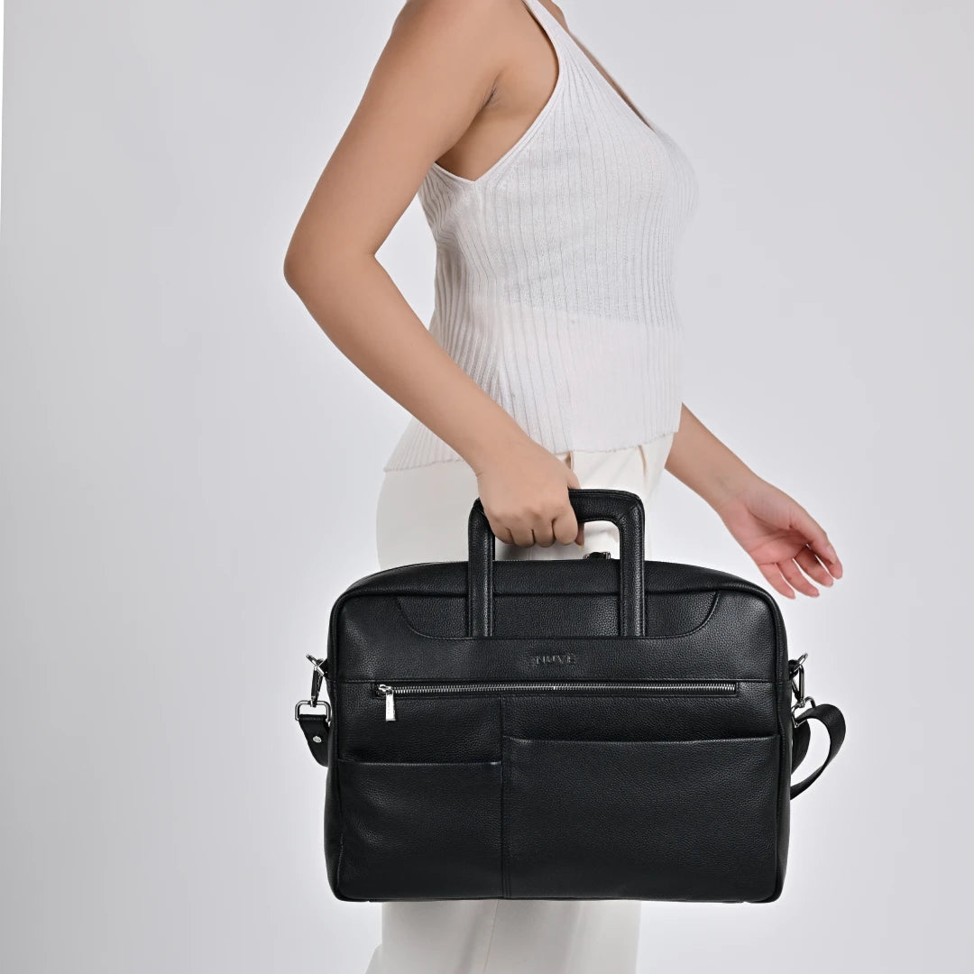 Professional and highly organized, this portfolio bag is made for those who need to carry more than just the basics. Crafted from 100% genuine leather grain, it offers a structured silhouette that holds its shape while keeping contents secure with a metal zipper closure. Inside, there’s room for documents, devices, and accessories, with a total of 11 pockets, including dedicated zip, open, and magnet compartments. The top handle makes it easy to carry in hand, while the detachable shoulder strap offers an alternative for longer commutes. Available in Black and Navy, it blends functionality with a polished business look. A spacious, business-ready portfolio bag designed to keep work essentials neatly organized and easy to access.